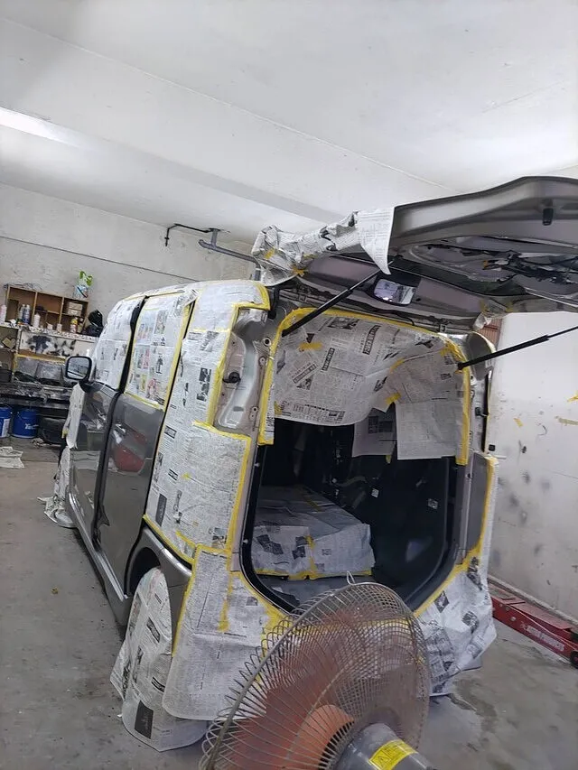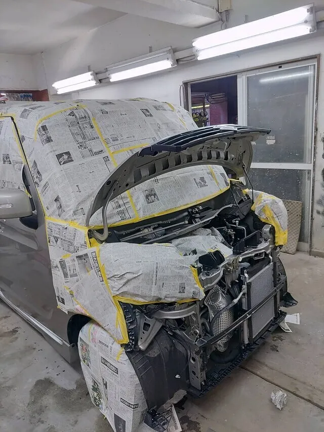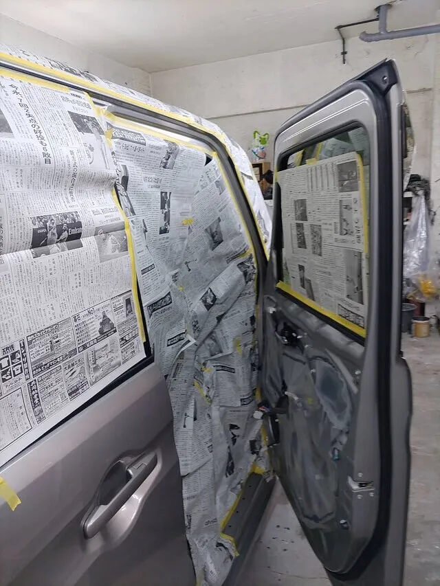 例えば、この写真のようにボディ全体を養生しておけば、塗料や薬剤が余計な場所につく心配もありません。